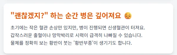 당뇨망막병증의 진행 과정을 알면 왜 정기검진이 그토록 중요한지 쉽게 이해할 수 있습니다.