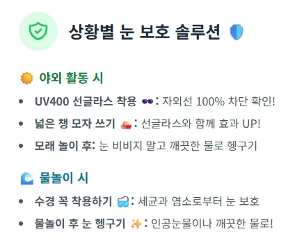 수영 후 눈 세척: 물놀이 후에는 반드시 깨끗한 물이나 인공눈물로 눈을 부드럽게 헹궈주는 것이 좋습니다. 눈을 비비지 않도록 하고, 눈에 이상 증상이 나타나면 즉시 안과를 방문해야 합니다.