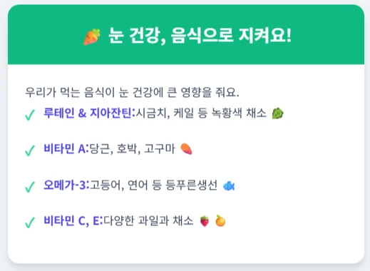 • 눈 건강에 좋은 영양 섭취: 우리가 먹는 음식 또한 눈 건강에 큰 영향을 미칩니다.