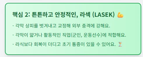 • 특징: 라식처럼 각막 절편을 만들지 않기 때문에 외부 충격에 강하다는 장점이 있습니다. 이 때문에 각막이 얇거나 활동량이 많은 운동선수, 군인 등에게 적합합니다. 하지만 상피 재생 기간이 필요하여 회복 기간이 라식보다 길고, 초기 통증이 동반될 수 있습니다.