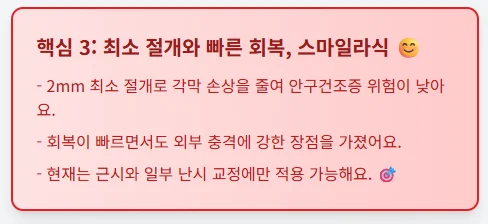 • 안구건조증: 수술 후 일시적으로 발생할 수 있으며, 인공눈물 점안, 안약 사용 등으로 관리합니다. 스마일라식은 각막 신경 손상이 적어 안구건조증 발생률이 가장 낮습니다.