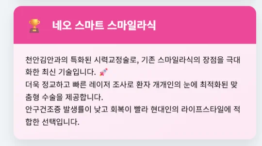 • 안구건조증 유무: 평소 눈이 건조하다면 안구건조증 유발 가능성이 낮은 스마일라식을 우선적으로 고려해 볼 수 있습니다. 특히 저희 천안김안과의 네오 스마트 스마일라식은 안구건조증에 대한 우려를 덜어줄 수 있는 효과적인 선택지입니다.